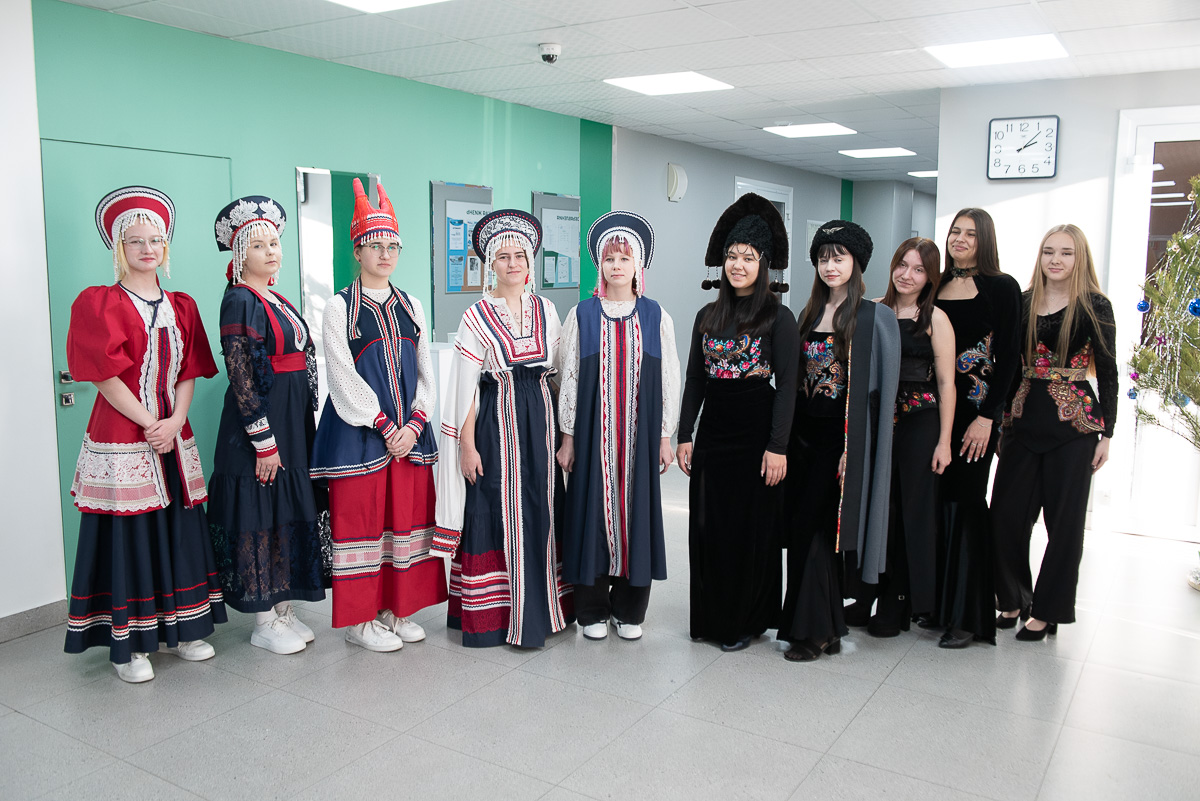 Это наряд из коллекции одежды «Корни», которую сшили студентки 3 курса по профессии «Закройщик». Вдохновение они черпали из традиций старообрядцев. Кстати, эта коллекция в этом году заняла первое место на региональном этапе всероссийской «Студенческой весны». Показали гостям еще одну коллекцию «Хозяйка медной горы» — она отсылает к культуру и традициям казачества, и в ней студенты стилизовали русские платки.