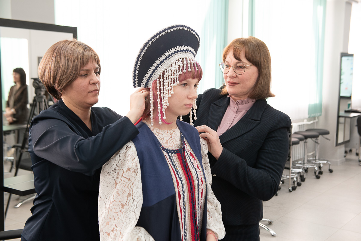Финалом праздника стало дефиле — в еще одной мастерской колледжа, где работают будущие кутюрье, Кристине подобрали стилизованный народный образ с ярким кокошником.