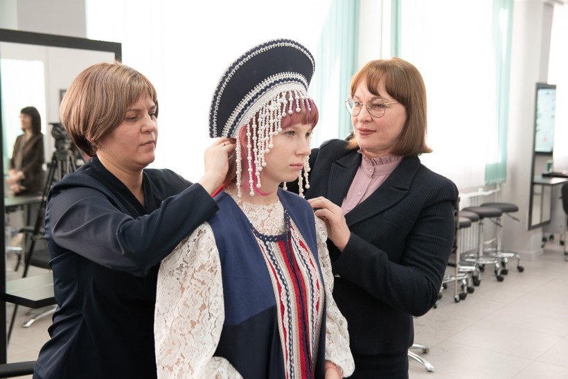 Это наряд из коллекции одежды «Корни», которую пошили студентки 3 курса по профессии «Закройщик». Вдохновение они черпали из традиций старообрядцев. Кстати, эта коллекция в этом году заняла первое место на региональном этапе всероссийской «Студенческая весна». Показали гостям еще одну коллекцию «Хозяйка медной горы» — она отсылает к культуру и традициям казачества, и в ней студенты стилизовали русские платки.