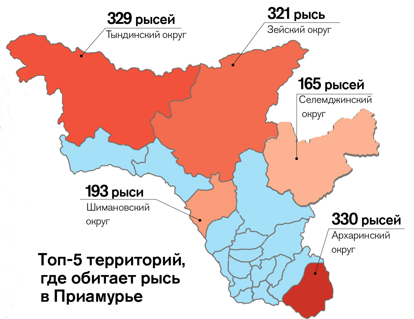— Всего в регионе насчитывается 1915 особей, по данным зимних маршрутных учетов. Больше всего рыси в Архаринском, Тындинской и Зейском округах — там, где лесная растительность. В Благовещенском округе обитает 59 диких кошек. У рысей толстый мех, они не боятся морозов. Спят под поваленным деревом или находят углубление в скале, предпочитают находиться в укрытии. В марте у рысей обычно гон, через 70 суток рождаются котята, еще через месяц мать начинает кормить их мясом. Они вырастают и отходят от матери, идет их расселение. Молодые особи ищут себе ареал обитания, и иногда заходят к людям, где легче найти корм. Кроме человека, естественных врагов у рыси немного — это волк, тигр и росомаха.