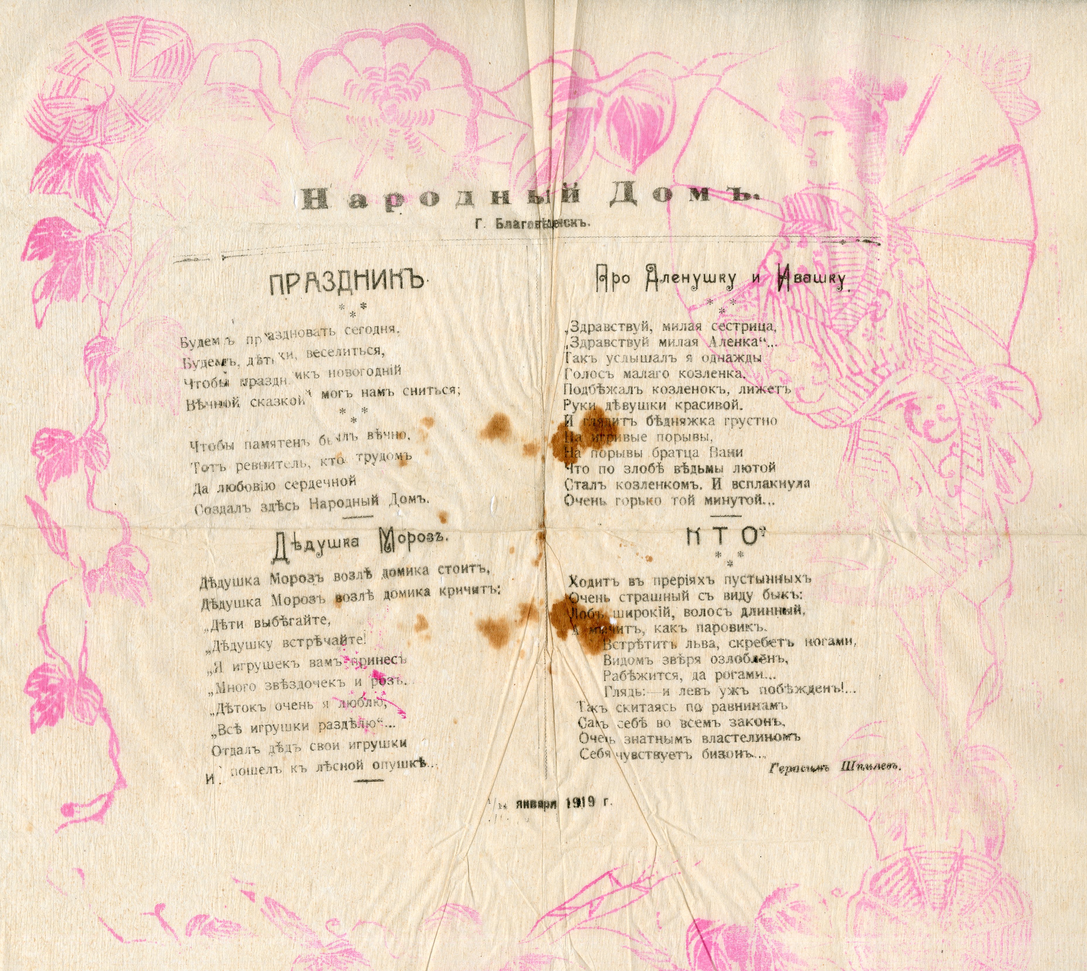 А в пакете, кроме сладостей, ждал сюрприз — салфетка со стихами Герасима Шпилёва (одного из первых редакторов «Амурской правды») про Дедушку Мороза, сестрицу Алёнушку и братца Иванушку и даже про неведомого «властелина прерий» бизона. А ещё — стихотворение о «ревнителе», о том, «кто трудом да любовию сердечной создал здесь Народный Дом», кто взял на себя «украшение ёлки, приготовление подарков, угощение детей». В самом низу — дата — «1/14 января 1919 год».