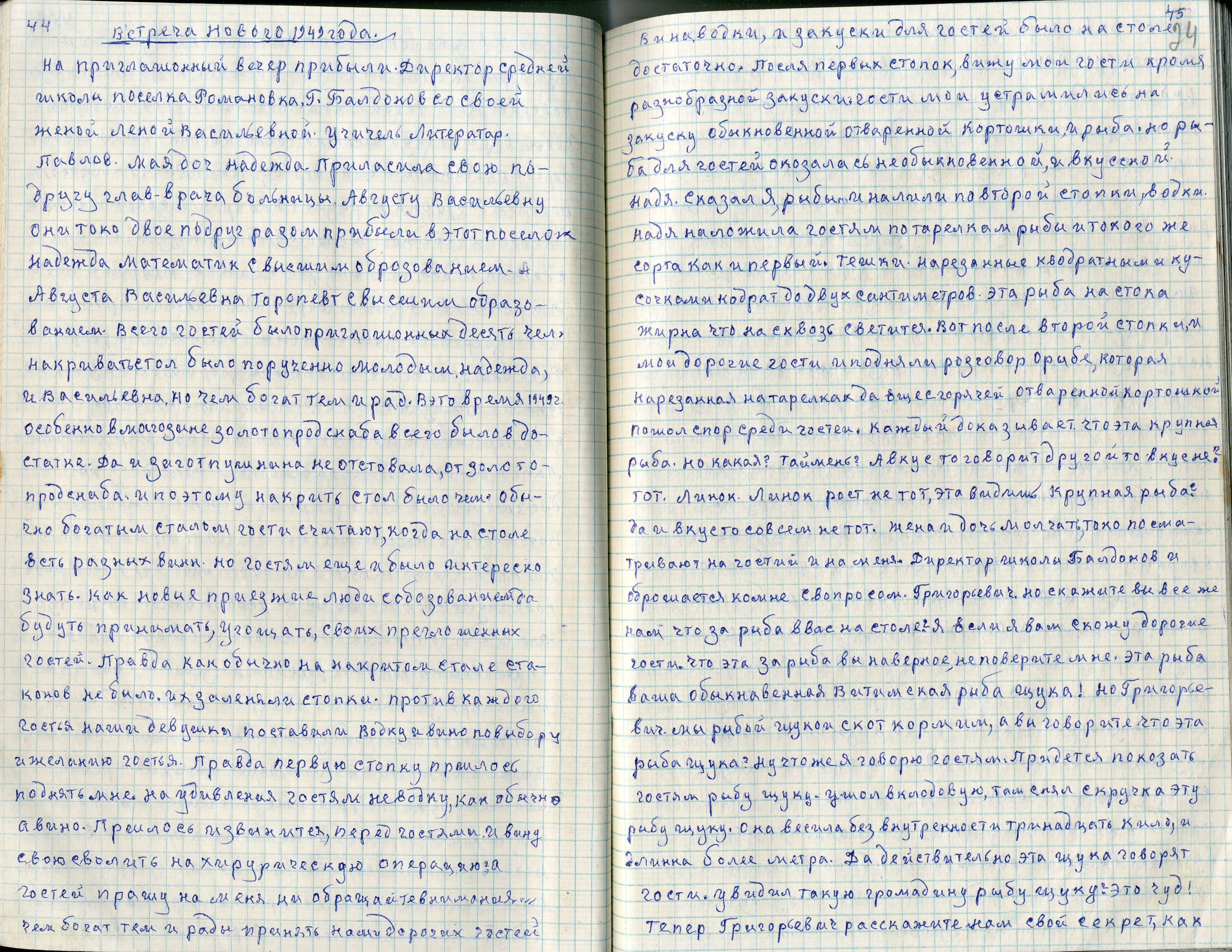 «На приглашенный вечер прибыли директор средней школы села Романовка Г. Балдонов со своей женой Леной Васильевной, учитель-литератор Павлов, моя дочь Надежда пригласила свою подругу главврача больницы Августу Васильевну. Надежда — математик с высшим образованием. Августа Васильевна — терапевт с высшим образованием. Всего гостей было десять человек.