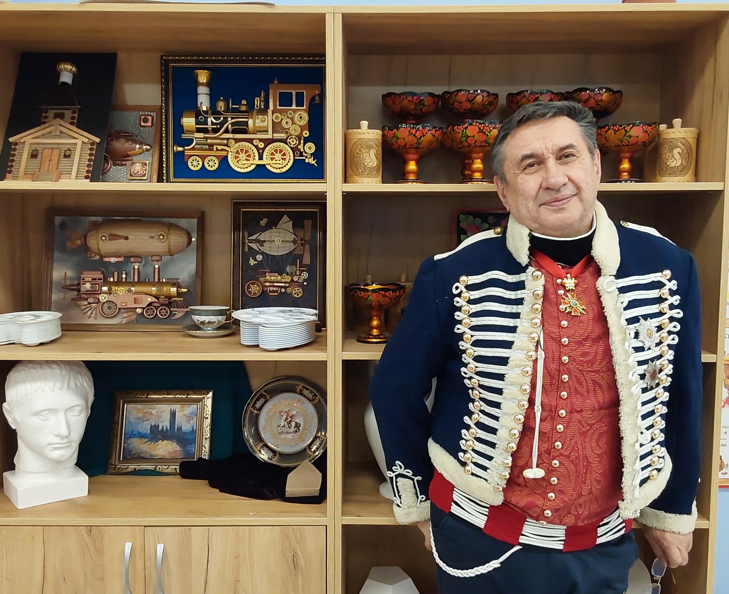 В доме повсюду — книги об искусстве и картины, старинные ордена и генеральская форма, на шкафу белел макет парусника с замысловатыми узорами, а со стены на гостей смотрел портрет хозяина в форме офицера Белой гвардии. Коллекция уникальных черепашек и монет, нагрудных знаков и гербов, энциклопедии исторической униформы и баварский замок в миниатюре: каждая вещь была подобна экспонату, который хочется рассматривать часами.