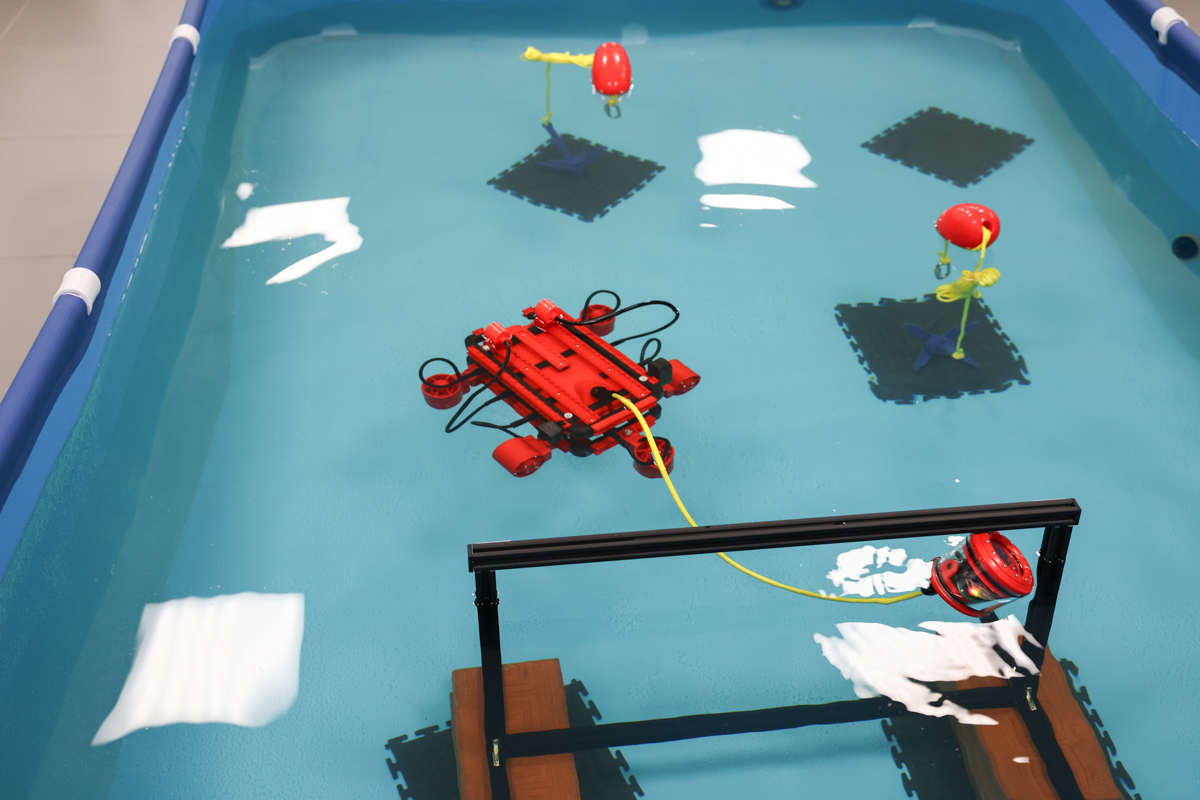 Участники в возрасте от 15 до 17 лет с помощью дронов проходили эстафету: их роботы должны были не просто перемещаться под водой, но и своими манипуляторами-хватами собирать и перемещать кольца. А потом передавать эстафету роботу с магнитным захватом, который собирает уже магниты.
