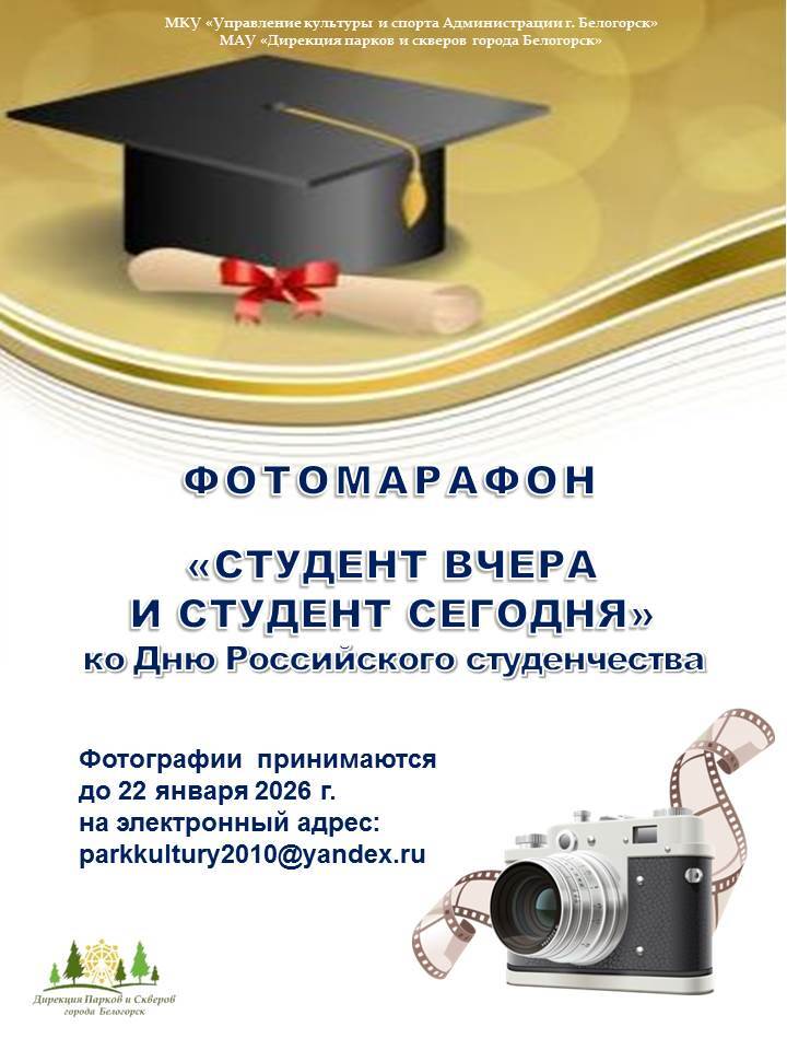 Белогорский горпарк приглашает горожан вспомнить студенческие годы и рассказать о них с помощью фотографий. Поделиться снимками из своих архивов, запечатлевшими яркие моменты учебы, общежития, стройотрядов, праздников, лекций или дружеских встреч, можно будет с 19 по 22 января включительно. Все фотографии организаторы опубликуют 25 января, в День российского студенчества, в праздничном видеоролике на всех информационных ресурсах парка.