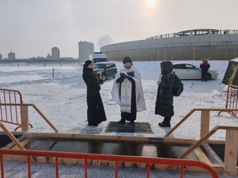 Крещенская купель на реке Амур открыта для желающих. Священнослужитель освятил праздничную прорубь, а также питьевую воду в цистерне. Об этом сообщили в мэрии Благовещенска.