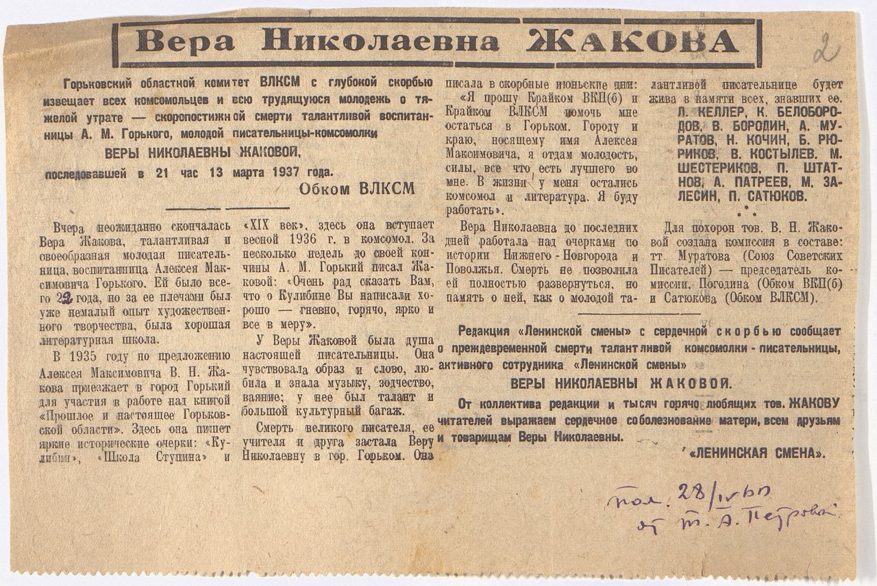 «Верочка, китайское чудовище и ведьма!» — так обращается к Вере Жаковой Максим Горький в письме 1934 года, ругая ее за то, что она разбрасывается и тратит свой талант.