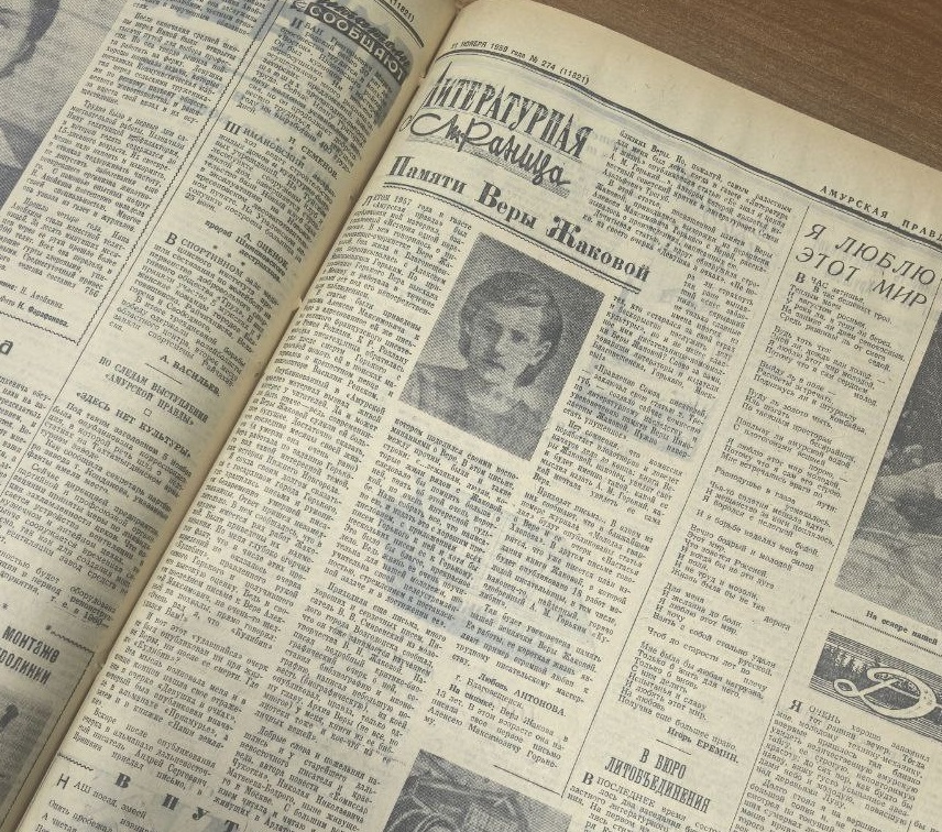 В музее есть работа 25-летней давности студента отделения журналистики АмГУ Егора Кузнецова. В ней молодой исследователь восстановил жизненный и творческий путь девушки. Ему даже повезло встретиться с амурской писательницей Любовью Антоновой незадолго до ее ухода из жизни. Побывал исследователь и в доме, где когда-то жила Вера Жакова. Но тогдашние хозяева не захотели пообщаться с молодым человеком.