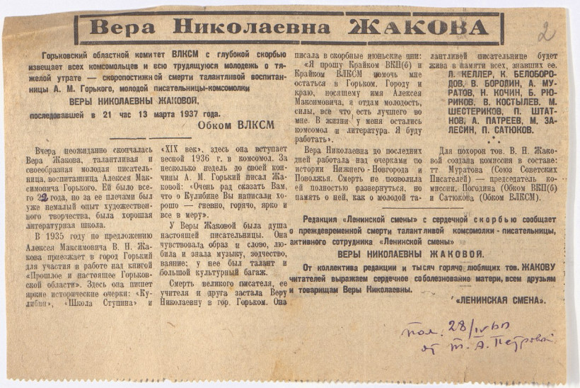 — Когда я стал собирать информацию, оказалось, что в Благовещенске мало кто слышал имя Веры. Мне за нее очень обидно. Хотелось бы, чтобы о ней говорили в школах. В XX веке известных личностей в Благовещенске было немного. Сейчас активно ведется патриотическое воспитание молодежи — мне кажется, важно показывать примеры тех, кто добился успехов в науке, литературе. И Вера Жакова — одна из таких личностей. К 22 годам она выпустила цикл повестей, публиковалась в таком издании, как «Вечерняя Москва», выступала в культурных сообществах того времени. В архивах я даже нашел билет со съезда Союза писателей СССР, куда она была приглашена. Это говорит о ее высоком статусе, — считает Алексей.