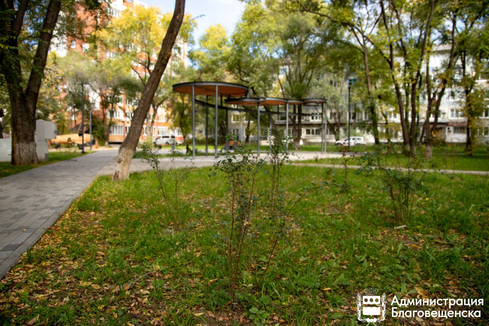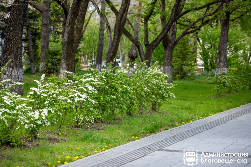 В Благовещенске проводится трехуровневое озеленение, которое включает посадку газонов и многолетников, слой кустарников и верхний ярус из деревьев. Состав растений подбирали специально под местный климат совместно с ДальГАУ и Центром развития территорий. Для высадки выбрали 5 пород деревьев и 21 вид кустарников, включая маньчжурские ясень и орех, пузыреплодник диабло, блестящий кизильник и амурский барбарис.