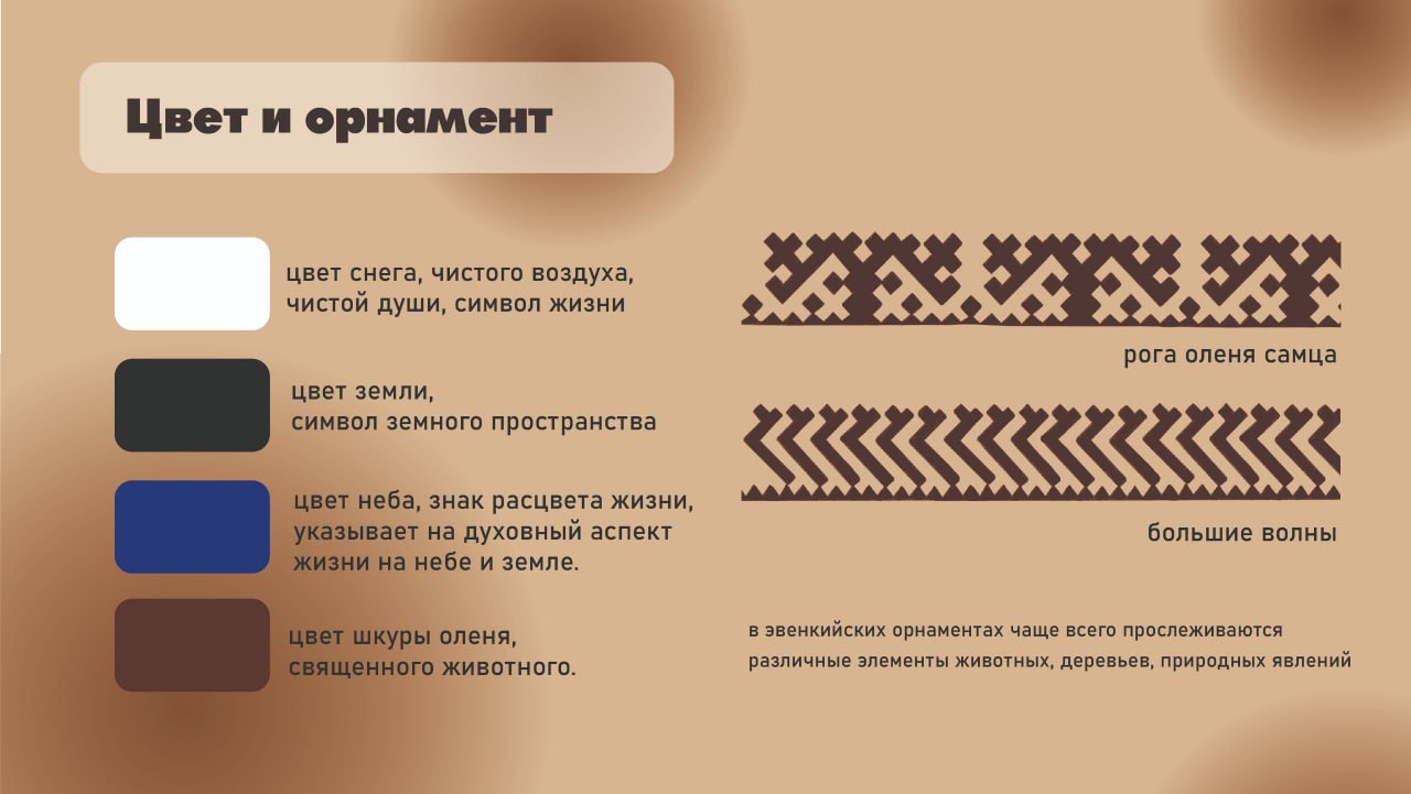 В эвенкийских орнаментах чаще всего прослеживаются различные элементы животных, деревьев, природных явлений. Ак, девушка использовала орнамент рогов оленей-самца. Он изображен в белом цвете — цвет снега, чистого воздуха, чистой души, символ жизни.