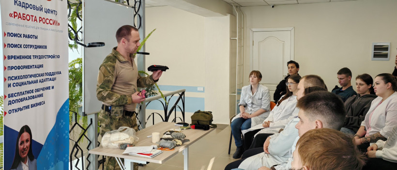 Студенты Амурского медицинского колледжа подчерпнули знания о боевой медицине в кадровом центре «Работа России» в Зее. Занятие провели под руководством ветерана боевых действий, который показал, как оказать первую помощь в экстремальных условиях.