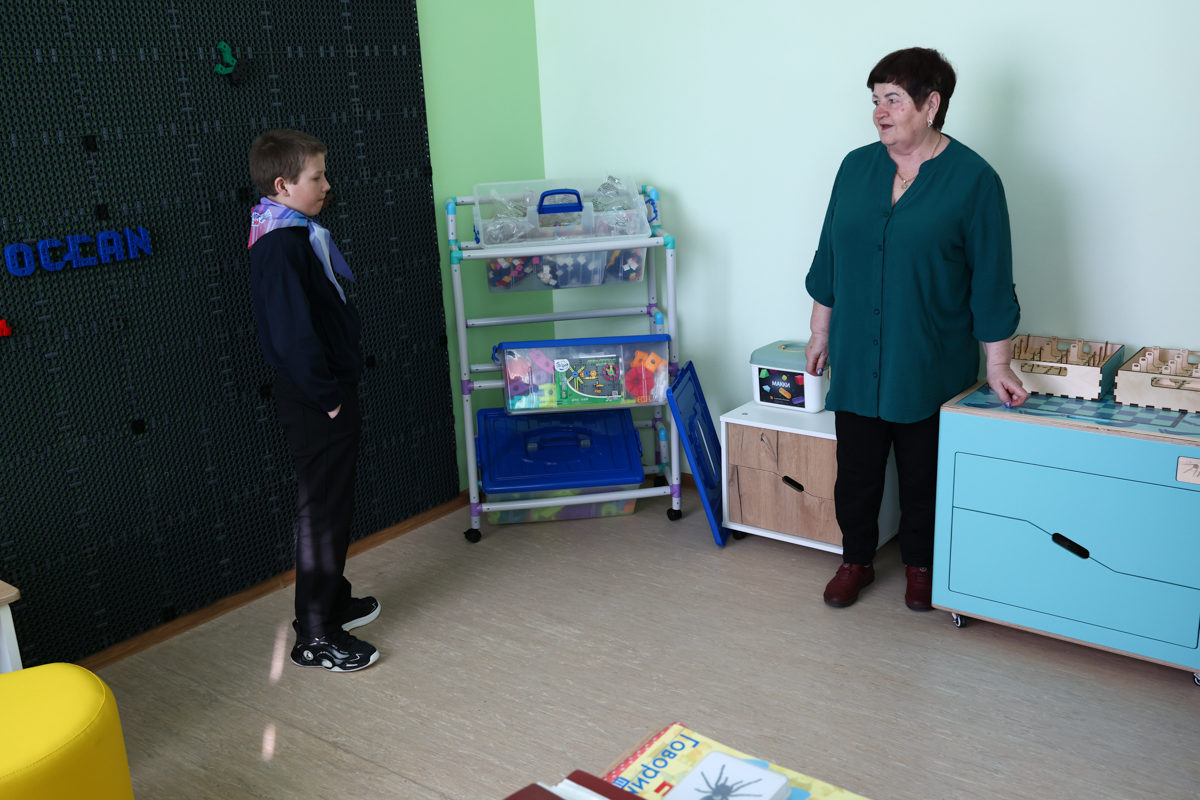 В кабинете педагога-психолога гостям продемонстрировали интерактивную песочницу и доску-конструктор. По ходу экскурсии директор школы Валентина Коломентьева делится планами — здание еще не успели «обжить», в ближайшее время его наполнят деталями: например, в холле планируют поставить книжную полку, чтобы ребята могли провести перемену с пользой.