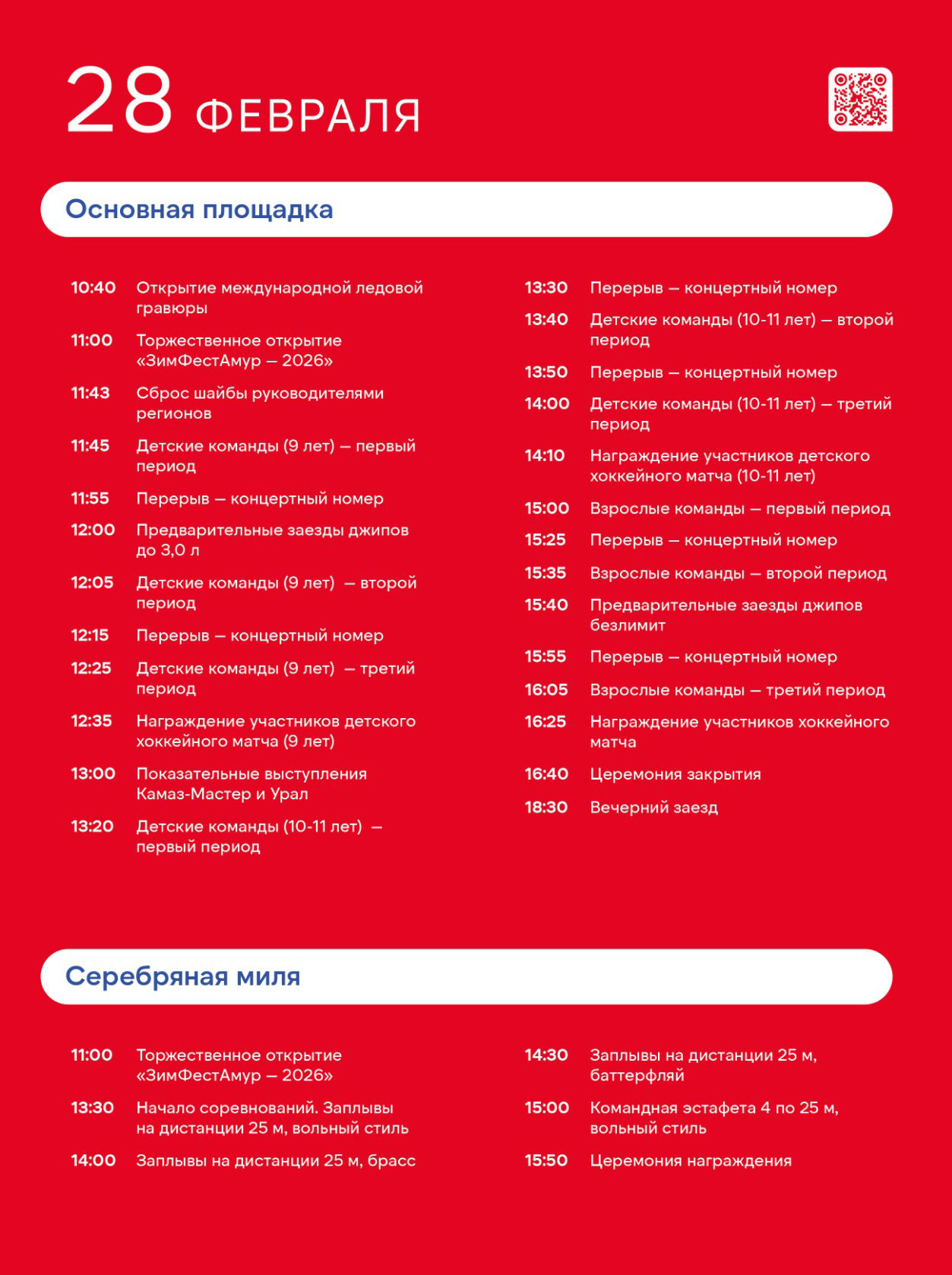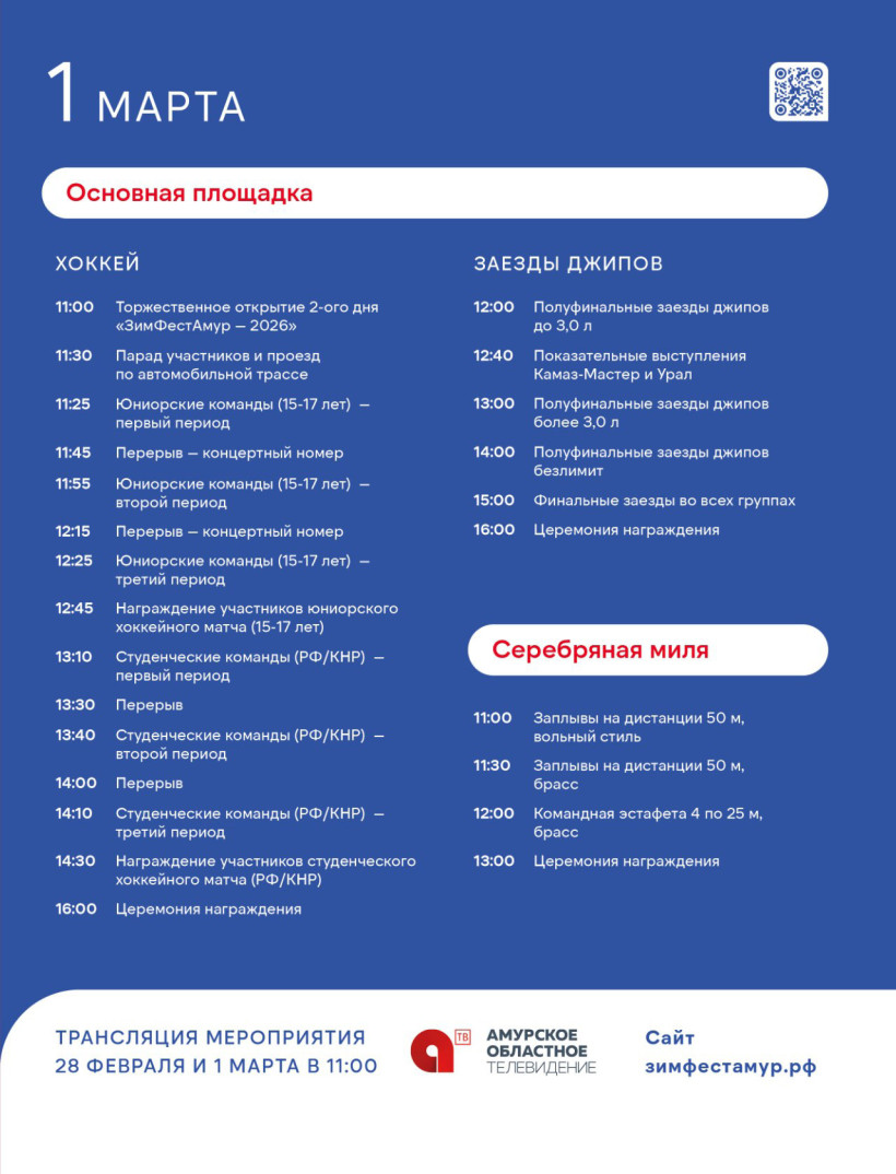 1 марта состоятся хоккейные матчи юниорских и студенческих команд России и Китая, а также заезды джипов и показательные выступления команд «КАМАЗ-Мастер» и «Урал». На «Серебряной миле» также пройдут заплывы на разные дистанции.