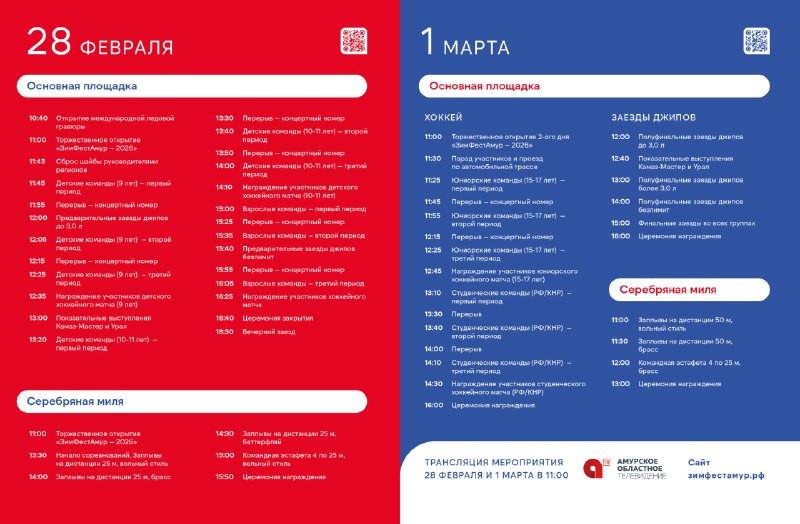 1 марта состоятся хоккейные матчи юниорских и студенческих команд России и Китая, а также заезды джипов и показательные выступления команд КАМАЗ-Мастер и Урал. На Серебряной миле также пройдут заплывы на разные дистанции.