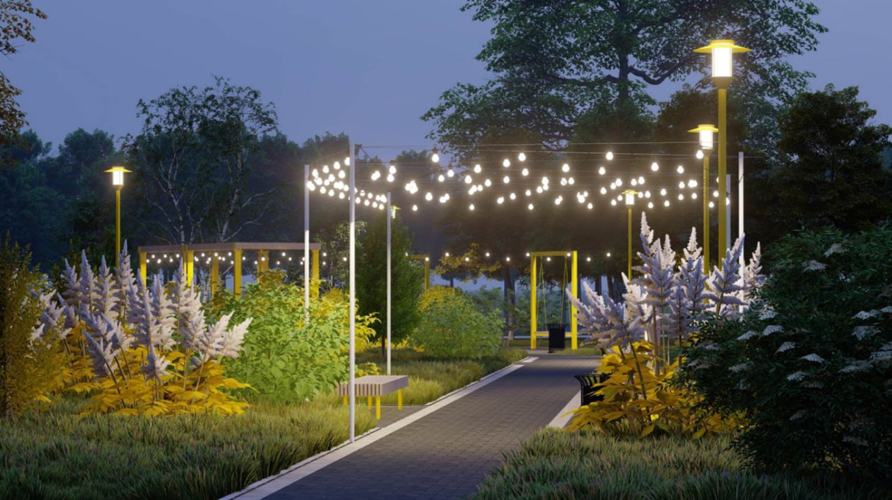 В сквере установят качели и скамейки в зонах тихого отдыха, смонтируют уличное освещение и декоративные гирлянды. Одним из визуальных акцентов станет световая конструкция «#СтрануМеняютЛюди».