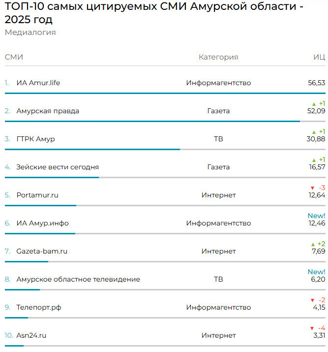 Областная общественно-политическая газета «Амурская правда» заняла второе место в рейтинге самых цитируемых СМИ Амурской области за 2025 год. Данные опубликовала компания «Медиалогия», которая является лидером мониторинга и анализе СМИ и соцмедиа в России.