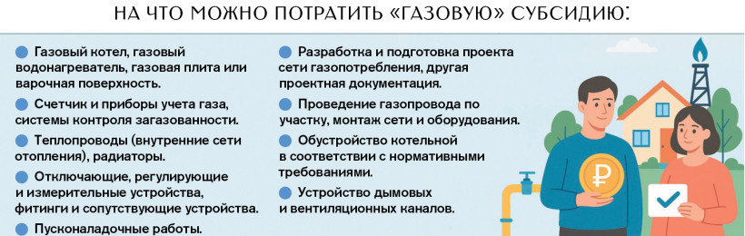 Сегодня субсидия учитывает, по сути, все расходы на газификацию дома: это и само оборудование, причем не только газовый котел, счетчики, но и газовая плита или газовый водонагреватель. А также проектирование — без него прокладывать и монтировать газопровод по участку, а также проводить работы в доме не получится. Сам монтаж труб и оборудования, а также обустройство помещения. Например, в доме было печное отопление и теперь необходимо установить радиаторы в комнатах и подвести к ним трубы с горячей водой.