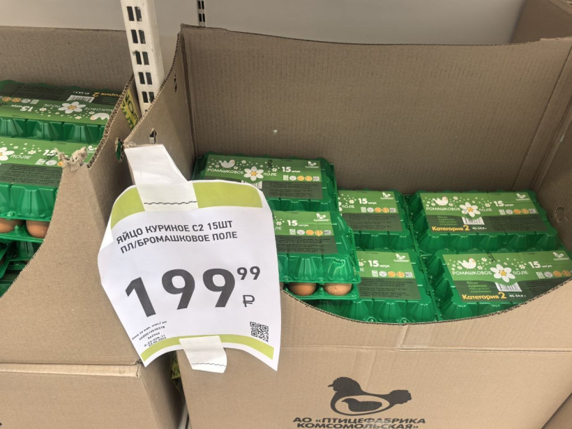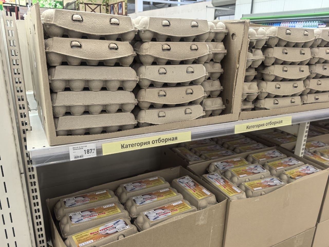 На прилавке также нашлись яйца под маркой «Ромашковое поле» от птицефабрики из Комсомольска-на-Амуре. Причем не только в стандартной, но и в «расширенной» упаковке на 15 штук – вторая категория в этом количестве предлагается за 199 рублей.