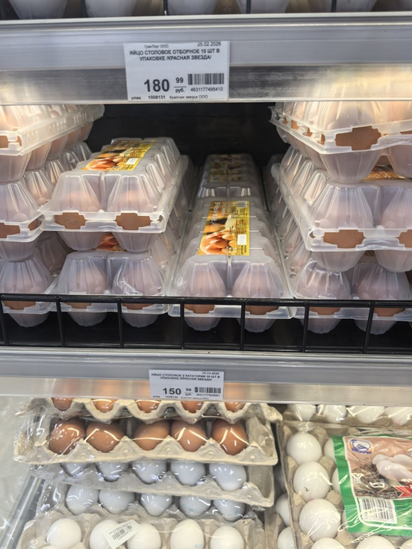 В торговой сети «Авоська» представлены два производителя — амурский «Красная звезда» и Белореченская птицефабрика. Десяток яиц второй категории от «Красной звезды» в упаковке без крышки обойдется в 138 рублей, а в пластиковой уже в 150. Отборное в упаковке – 180. Десяток 1 категории из Иркутска в аналогичной упаковке — 168 рублей, в пачке попроще за эту цену можно купить отборное.