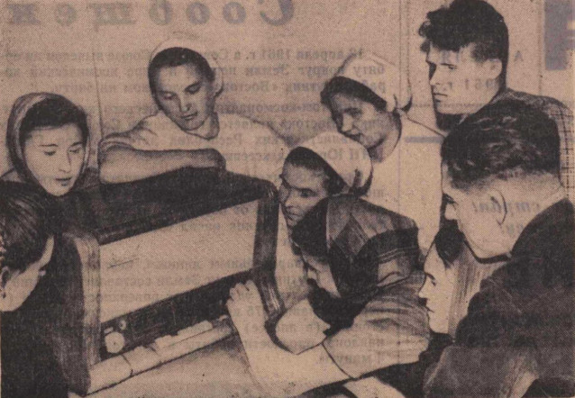 Главной темой номера «Амурской правды» 13 апреля 1961 года стал первый полет в космос человека. На фото — сотрудники Благовещенского хлебокомбината около радиоприемника. Труженики слушают слова диктора, сообщающего том, что советский космический корабль-спутник «Восток», на борту которого находится летчик Гагарин, штурмует межзвездное пространство.