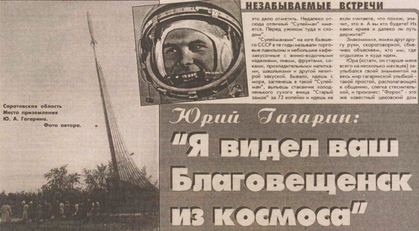 «До сих пор помню подробный рассказ экскурсовода о Гагарине, его полете вокруг Земли, прекрасных человеческих качествах Гражданина нашей планеты, отличном семьянине и обаятельном человеке», — делился с читателями «Амурской правды» Владимир Григорьев.