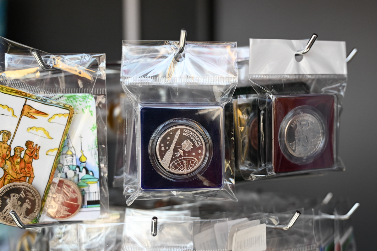 Настоящих коллекционеров больше привлечет стойка с «космическими» монетами от мастера Александра Козырева. Он начал получать заказы сразу после первого пуска ракеты.