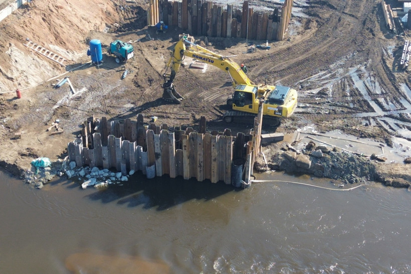 Раннее наступление тепла ускорило паводок, поэтому мостостроителям приходится оперативно отводить воду от будущего моста. Для осушения котлованов на опорах № 2, 3 и 4 применяют технологию тампонажных слоев. Исполнители держат на контроле все этапы, связанные с сезонными гидрологическими условиями.