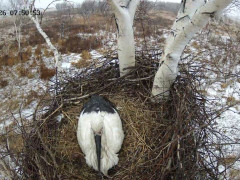 Аисты Амур и Зея ждут птенцов — сезон откладки яиц окончен, этой весной, как и прошлой, в гнезде четыре яйца. Минувшей ночью в Приамурье прошел мокрый снег, и самец заботливо укрывает будущую маму соломой, делится наблюдениями за птицами эколог Антон Сасин.