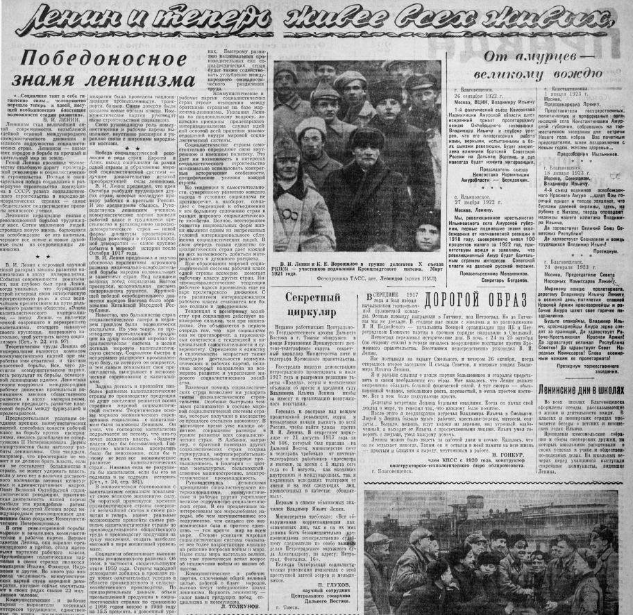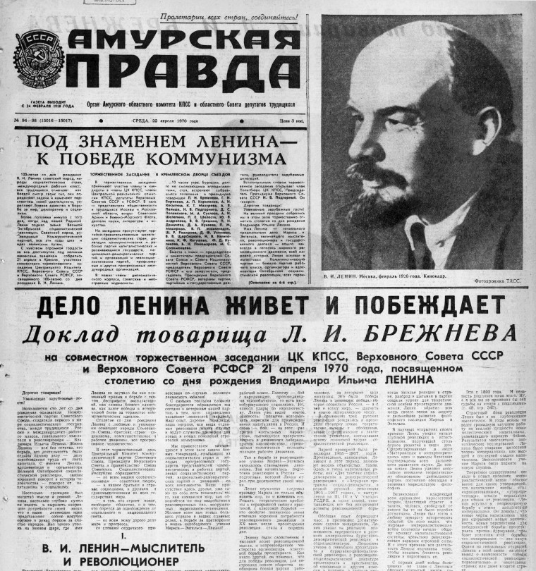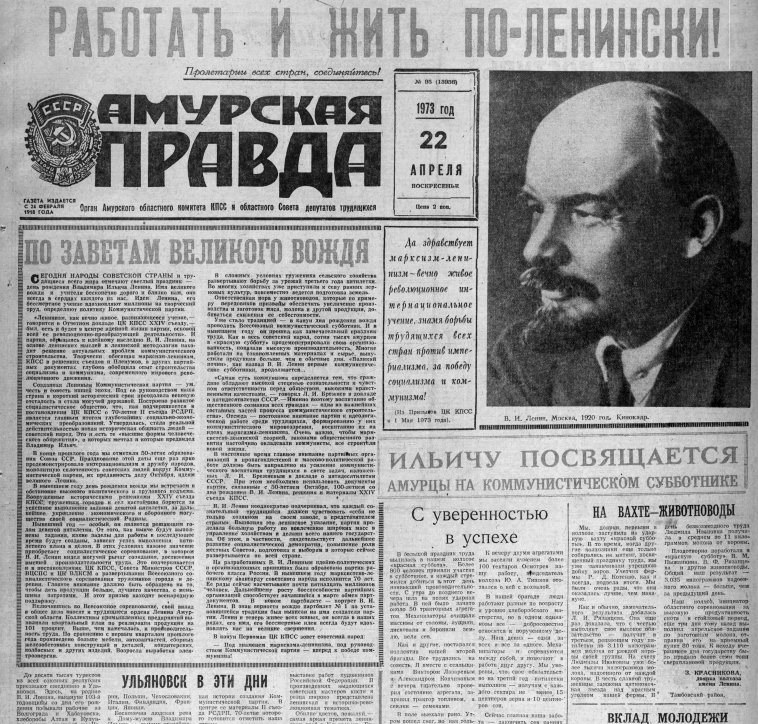Празднование столетия со дня рождения вождя охватывало все сферы жизни страны, и газета не оставалась в стороне. «Амурская правда» писала, что эту дату «советский народ, народы социалистических стран, международный рабочий класс отмечают как боевой смотр своих сил», а полосы пестрели такими заголовками: «Пусть живет в веках имя и дело Ленина», «Работать и жить по-ленински».