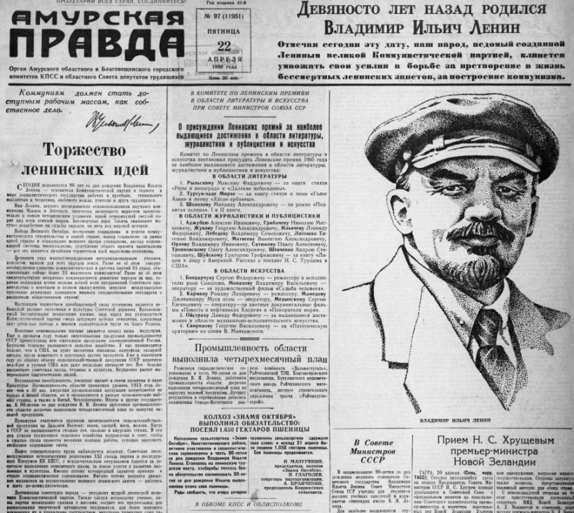 Чем ближе к юбилеям, тем громче становились заголовки. К 90-летию вождя на страницах «Амурской правды» вышли материалы «Ленин и теперь живее всех живых», «Живем по заветам Ильича». На первой полосе — лауреаты Ленинских премий, а ленинизм называли величайшей силой современности и знаменем всех народов в борьбе за мир.