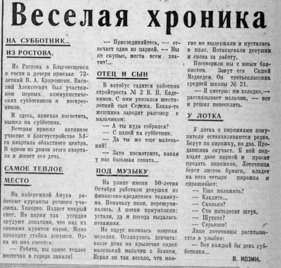 Даже суровые будни советского человека были пронизаны «ленинским» отношением к труду. В 1973-м на ленинском субботнике собрались 410 тысяч амурчан, а «Амурская правда» даже приводила забавные истории в рубрике «Веселая хроника». Одна запомнилась особенно: продавщица пирожков скучала у лотка, пока к ней не подошли двое парней и не попросили продать сразу полторы сотни пирожков. Женщина расплылась в улыбке: «Вот бы каждый день субботники».