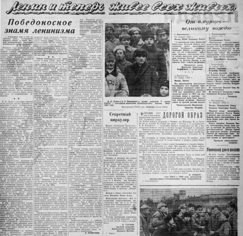 В те годы областная газета публиковала письма от амурчан самому Ленину — обращение к ушедшему вождю было способом выражения любви и преданности. На страницах печатались отчеты промышленности, сельского хозяйства и клятвы «умножать свои усилия»: колхоз имени Ленина отчитывался о надоях молока, а из Пекина приходили новости о том, что китайские товарищи тоже отмечают юбилейную дату и смотрят советский кинофильм «Ленин».