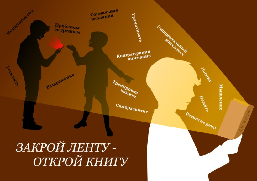 Милена Тлеубакова сделала плакат «Закрой ленту – открой книгу». Он критикует массовую зависимость от смартфонов и призывает общество вернуться к чтению книг для саморазвития. Также в работе затрагивается проблема буллинга тех детей, которые выбирают интеллектуальный рост вместо бездумного сидения в телефоне.