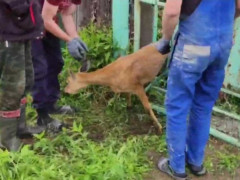 В селе Глухари Свободненского района в металлических воротах одного из частных домов застряла косуля. Случай произошел в четверг, 8 июня. Трое местных жителей пытались вызволить животное из западни.