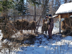 Хорошо просоленные веники, похожие на те, с которыми люди ходят в баню, рулоны сена, по форме напоминающие японские роллы и пшенично-соевые зерновые отходы, каждому дикому зверю — свое, отдельное питание. В Дирекции по охране и использованию животного мира и особоохраняемых природных территорий разработали особое меню для копытных. Например, изюбри и лоси предпочитают веточный корм, а кабаны — зерно. Каких необходимых для жизнедеятельности витаминов и микроэлементов сейчас нет в природе, те найдутся в специальной кормушке.