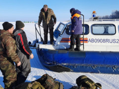 Группа амурских туристов застряла на льду Бурейского водохранилища. В 15 километрах от Талакана у них заглохли автомобили. На помощь приехали спасатели на катере-амфибии «Хивус».