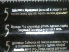 На волне историй про «группы смерти» и «синего кита» амурские социальные сети захватила новая пугающая история: жевательные резинки со «смертельными» заданиями. Среди пользователей интернета распространяется вкладыш популярной жевательной резинки Wrigley′s 5 «Правда или действие», который якобы содержит опасные призывы.